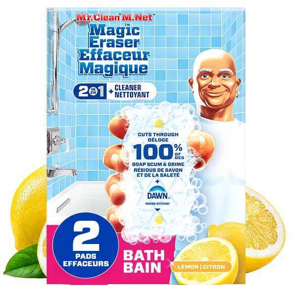 Mr. Clean Magic Eraser 2 in 1 has built-in cleaner and is tailor-made for all the messes your bathroom can throw at it. Just wet, squeeze, and erase bathroom messes with ease—even shaving cream, toothpaste, and makeup. This powerful cleaning sponge is a total bathroom cleaner. It cuts through soap scum on the first swipe, so you can spend less time scrubbing and more time tubbing. It combines Magic Eraser power with active foaming cleansers, making tough bathroom messes in your tub, sink, shower, bathroom floor, and more no big deal. And you’ll love the fresh lemon scent it leaves behind. Add Mr. Clean Magic Eraser to your arsenal of cleaning supplies today!