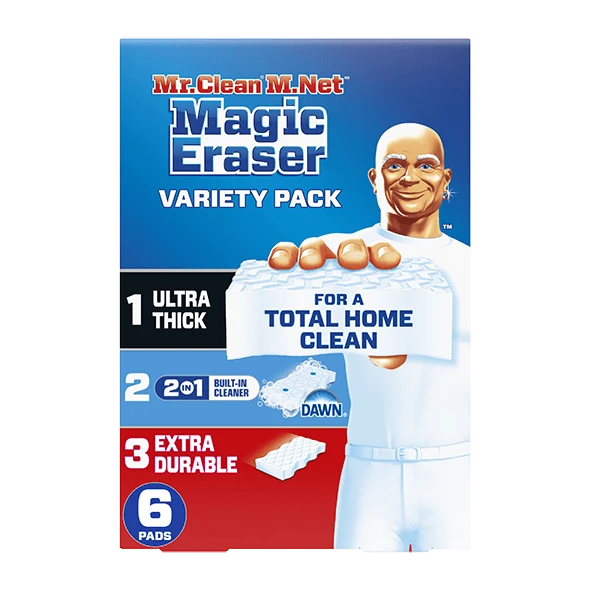 This Mr. Clean Magic Eraser Variety Pack is the ultimate solution for a total home clean! Pack includes 1 Ultra Thick Magic Eraser, 2 Ultra Foamy Magic Erasers and 3 Extra Durable Magic Erasers. Ultra Thick, our longest lasting eraser, Lasts 7X Longer*so you can tackle more messes all around the house. Ultra Foamy Magic Erasers combine the cleaning power of Dawn with the scrubbing power of Magic Eraser for a clean like you’ve never seen. Just wet, squeeze, and let the foam help you clean 150+ messes** around your home - no more sponges or other cleaning products needed. These all purpose cleaner erasers work on tough and tricky messes all over the house—even outdoors. Clean sticky messes in the microwave, soap scum in the shower, rings in the bathtub, greasy counters, glass stovetops, patio furniture, permanent marker, wine stains, and more! Use as a shoe cleaner, too! Add Mr. Clean Magic Erasers to your arsenal of cleaning supplies today.